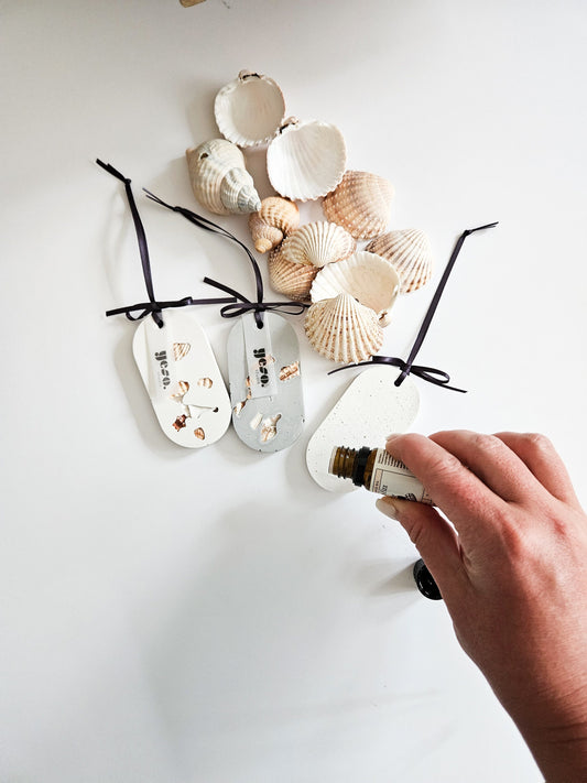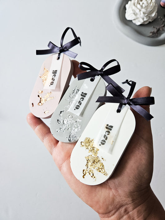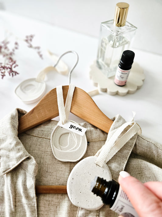 Beautiful and versatile stone tags to scent your wardrobe, drawers, or bathroom. Just add essential oils or perfume. No flames, no plugs, just fragrance.