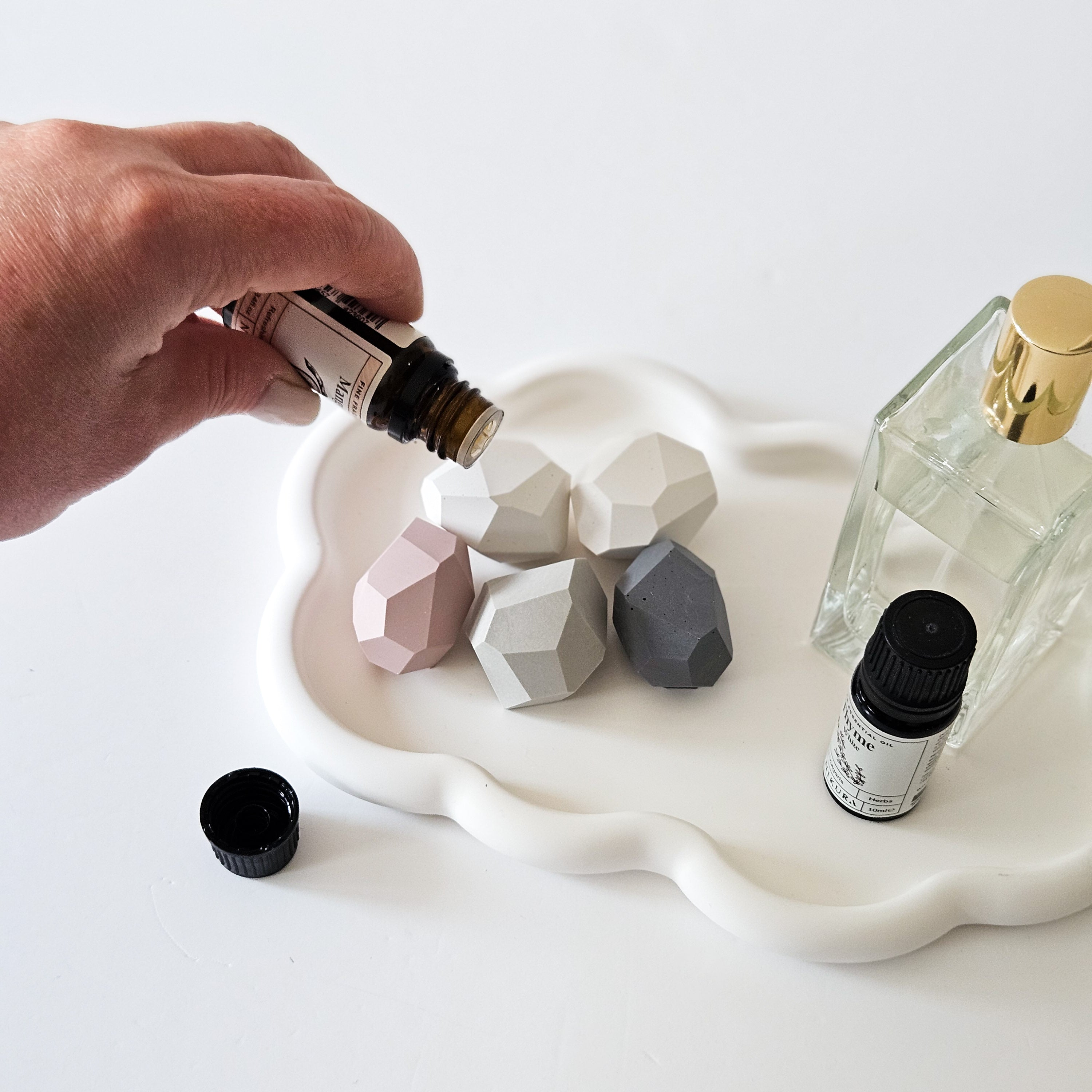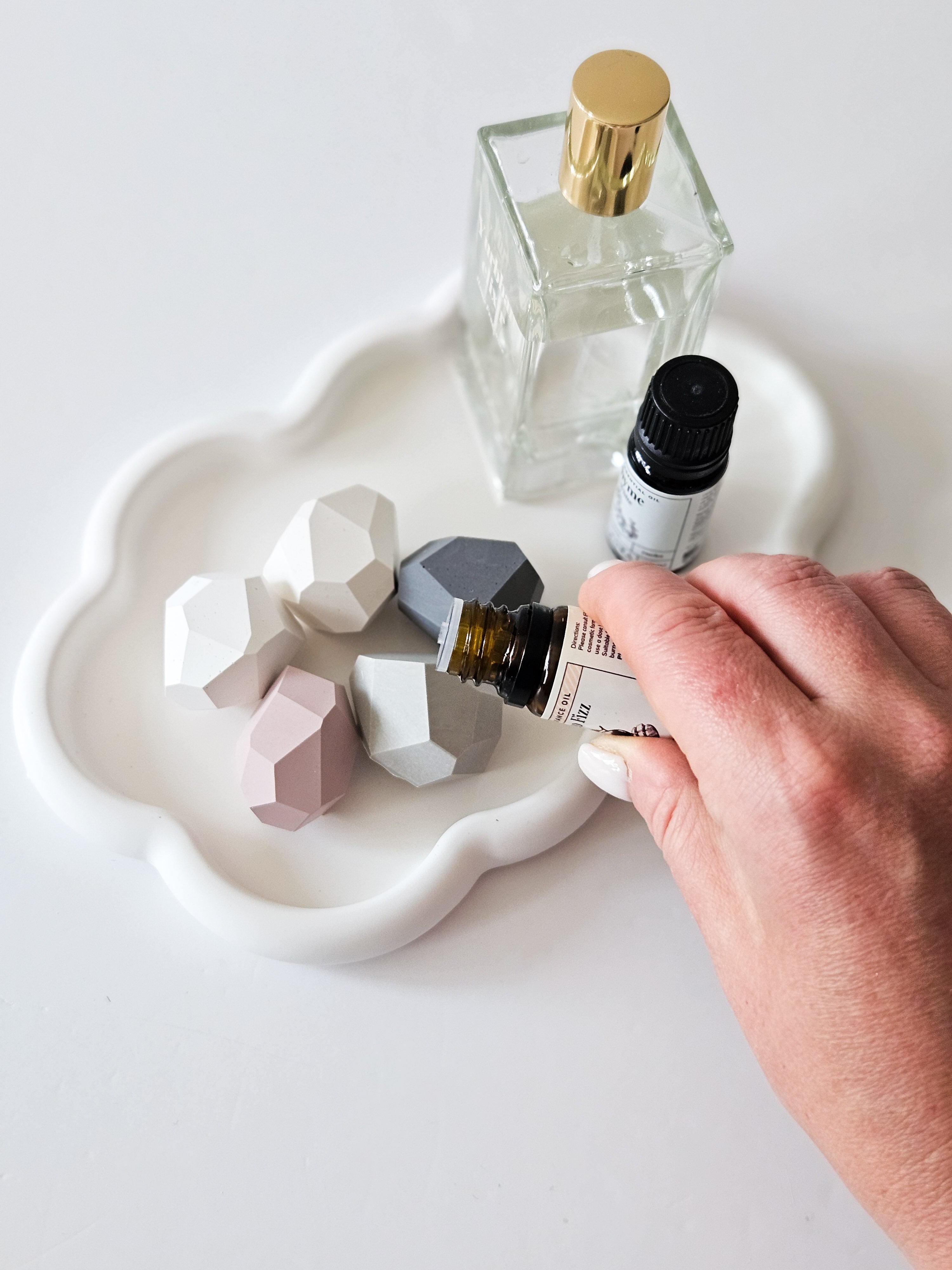 - Add 2-5 drops of your favourite essential oil or spritz lightly with perfume directly onto the surface. The porous stone will absorb the fragrance and diffuse it gradually.