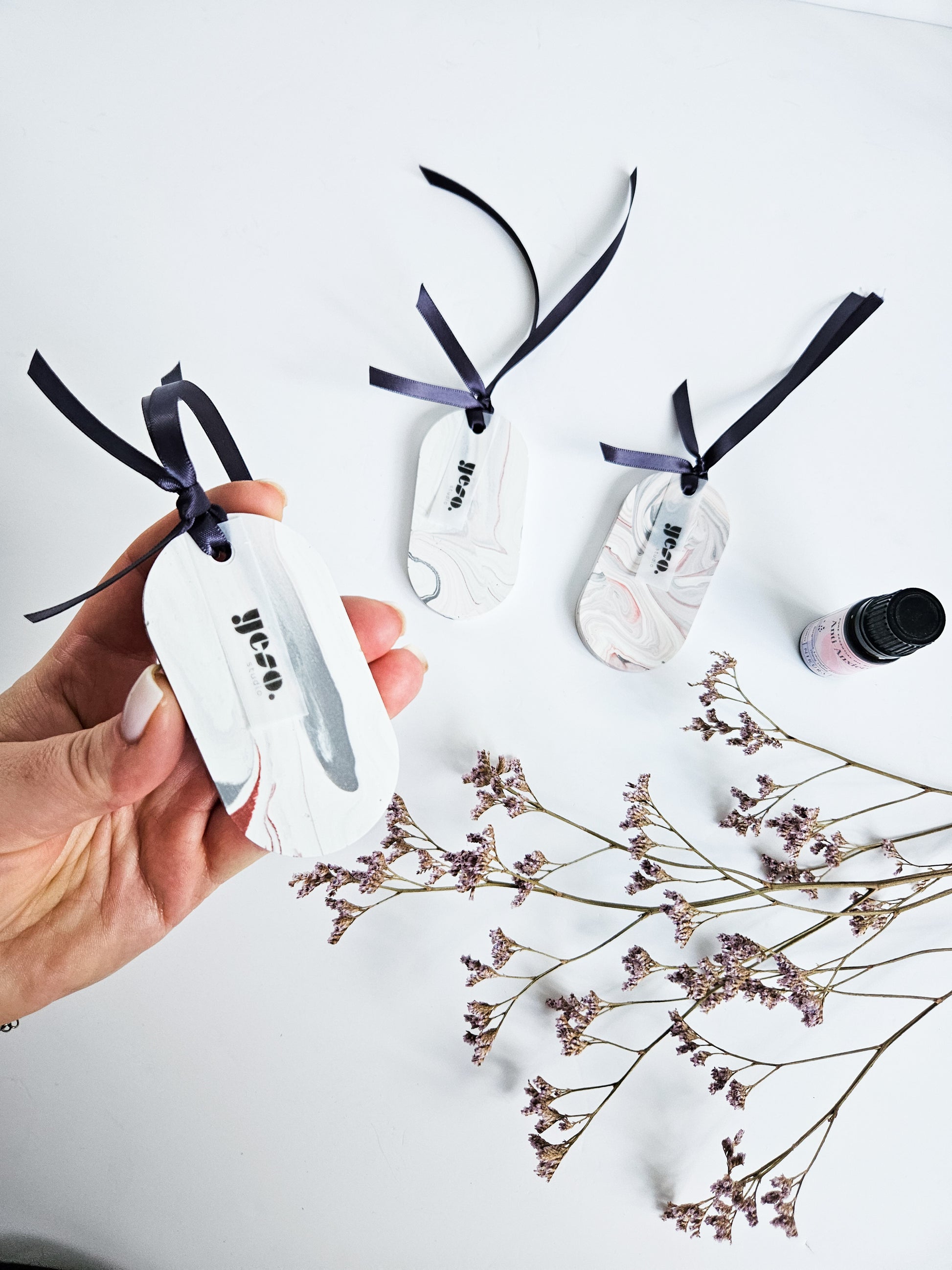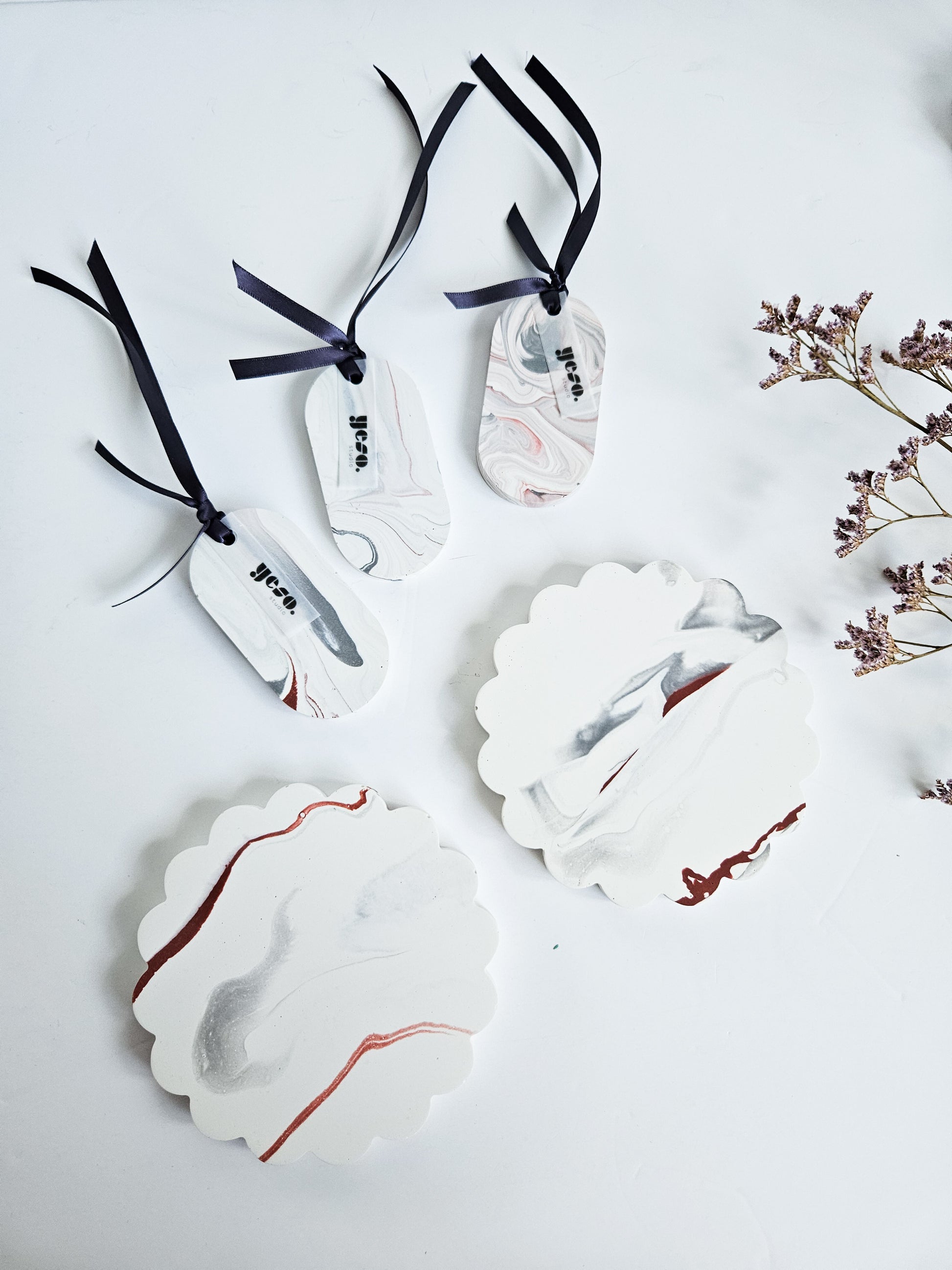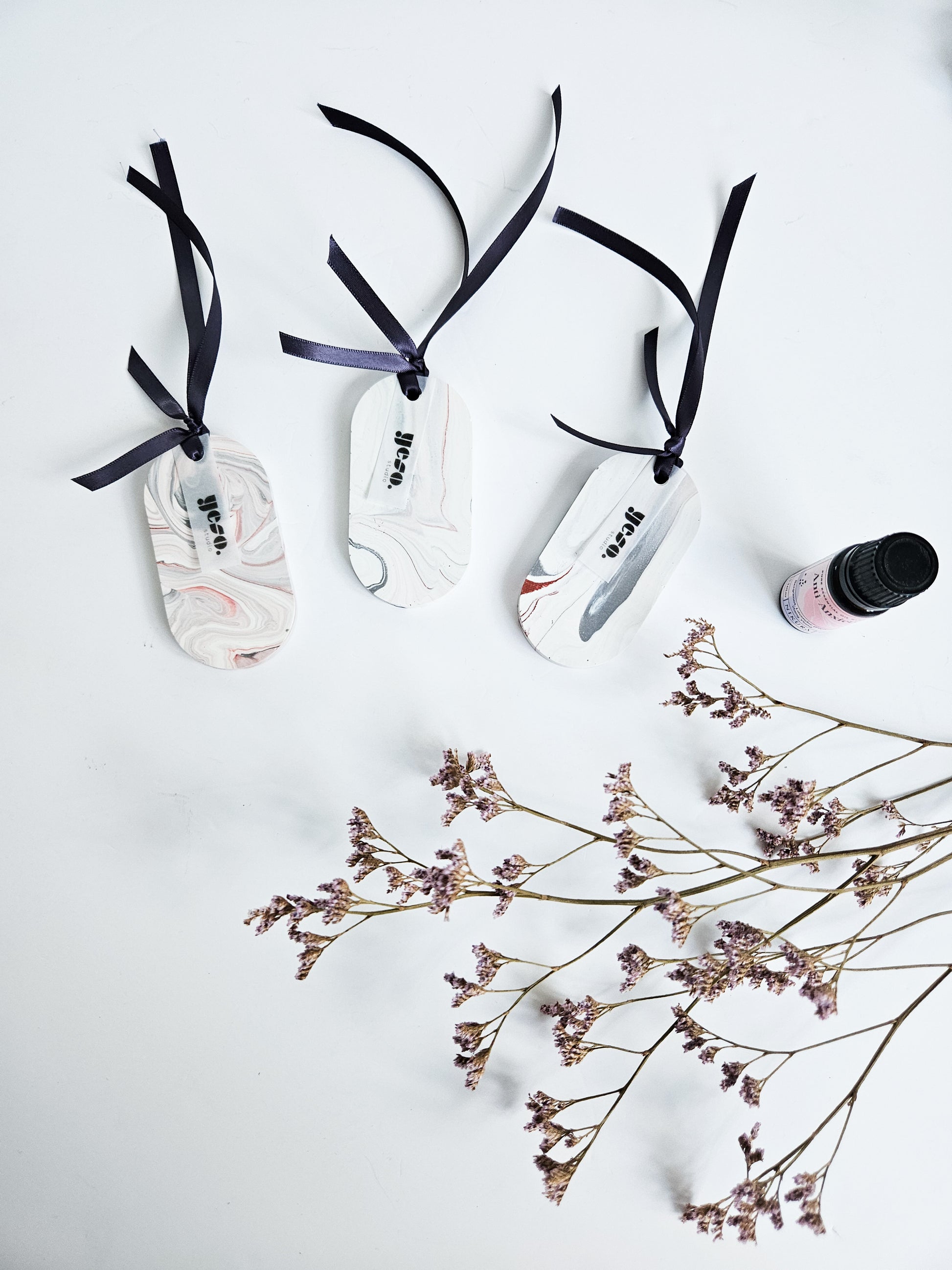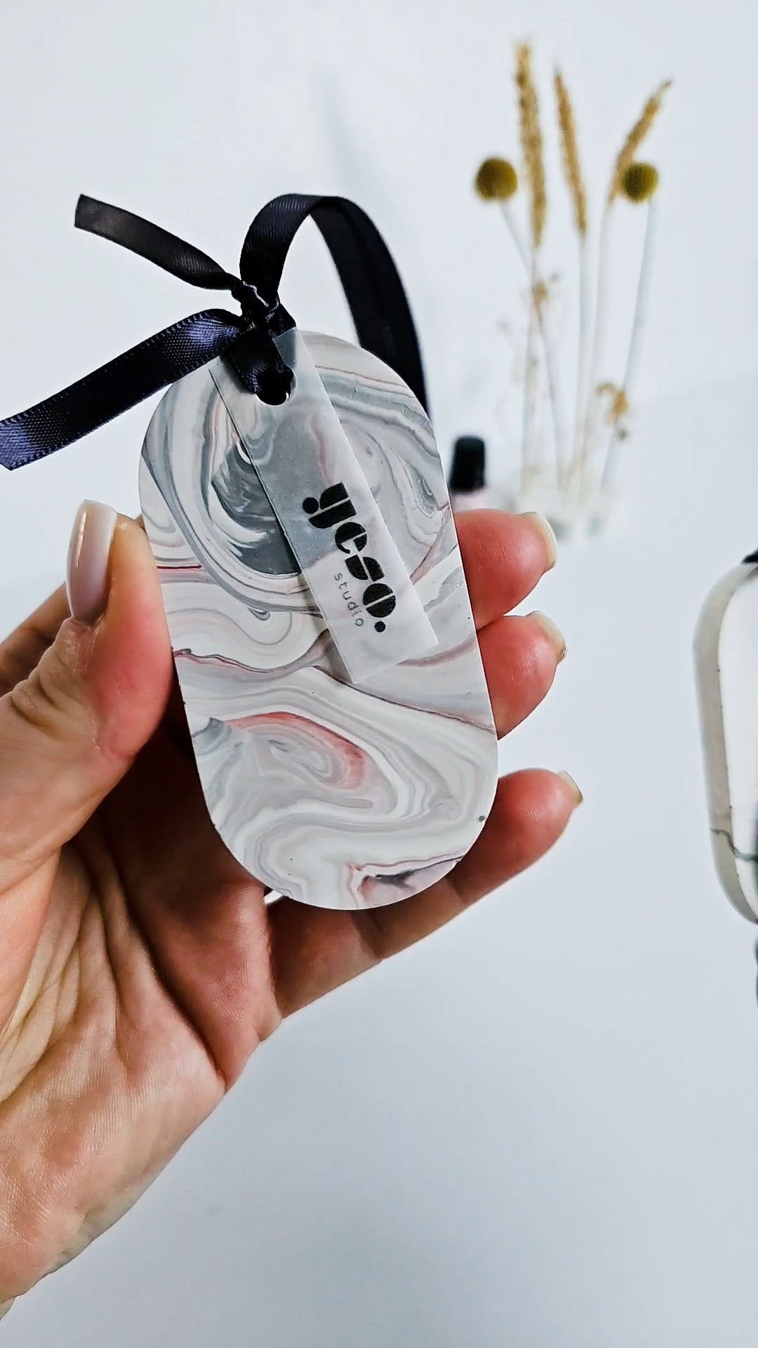 A beautiful set of three oval Aroma Stone Tags in a soft, balanced grey and white marble effect with a hint of red. These handmade tags bring a subtle elegance and can complement any room décor. Each tag is one-of-a-kind and poured by hand from eco-friendly Jesmonite, finished with a sleek anthracite ribbon for easy hanging.