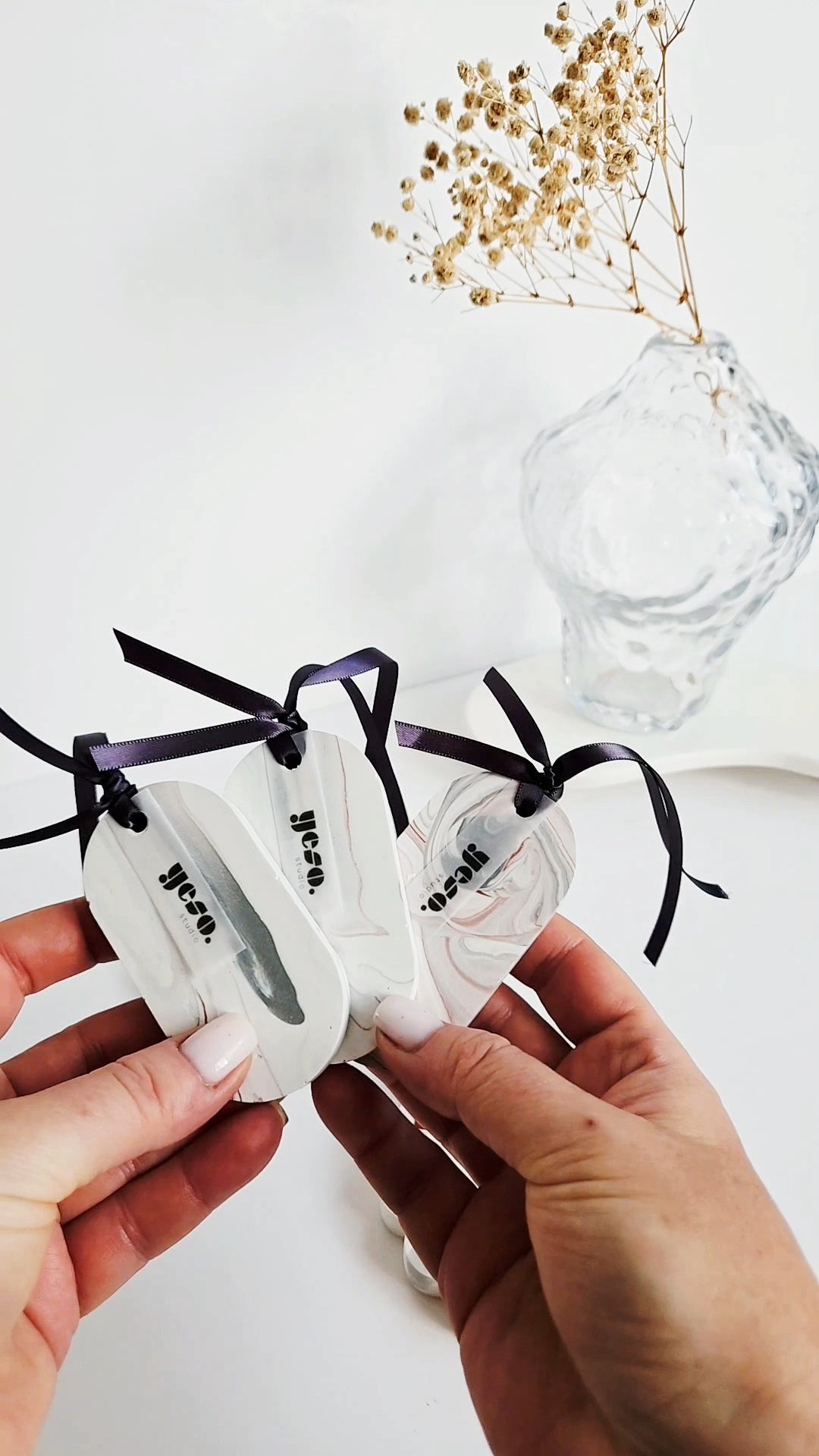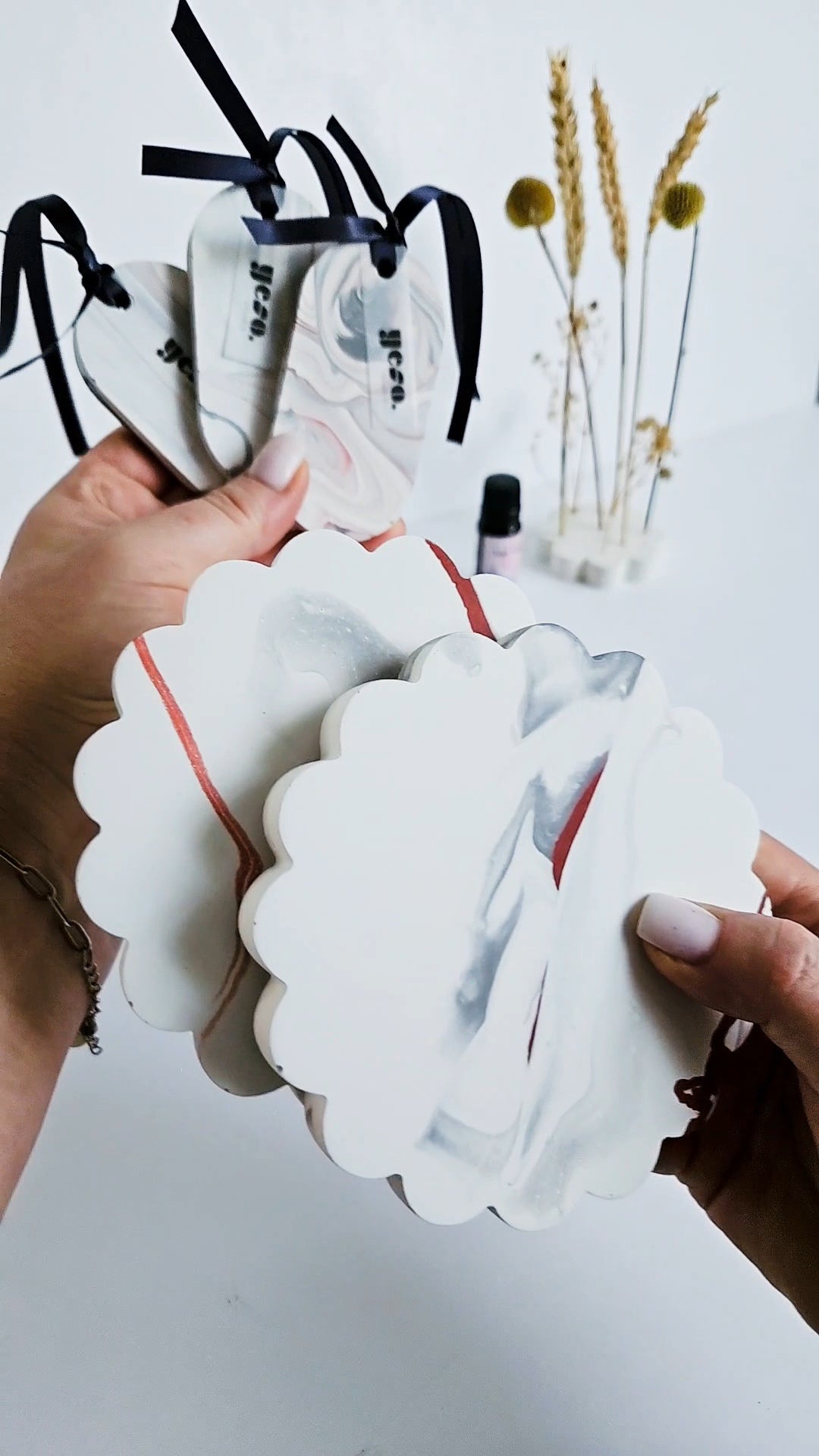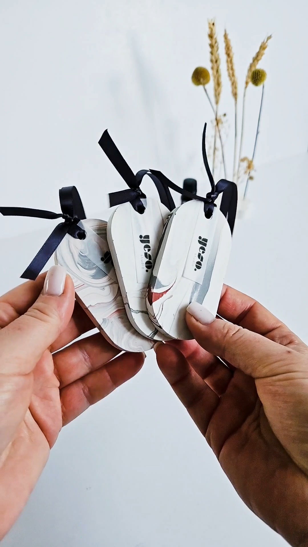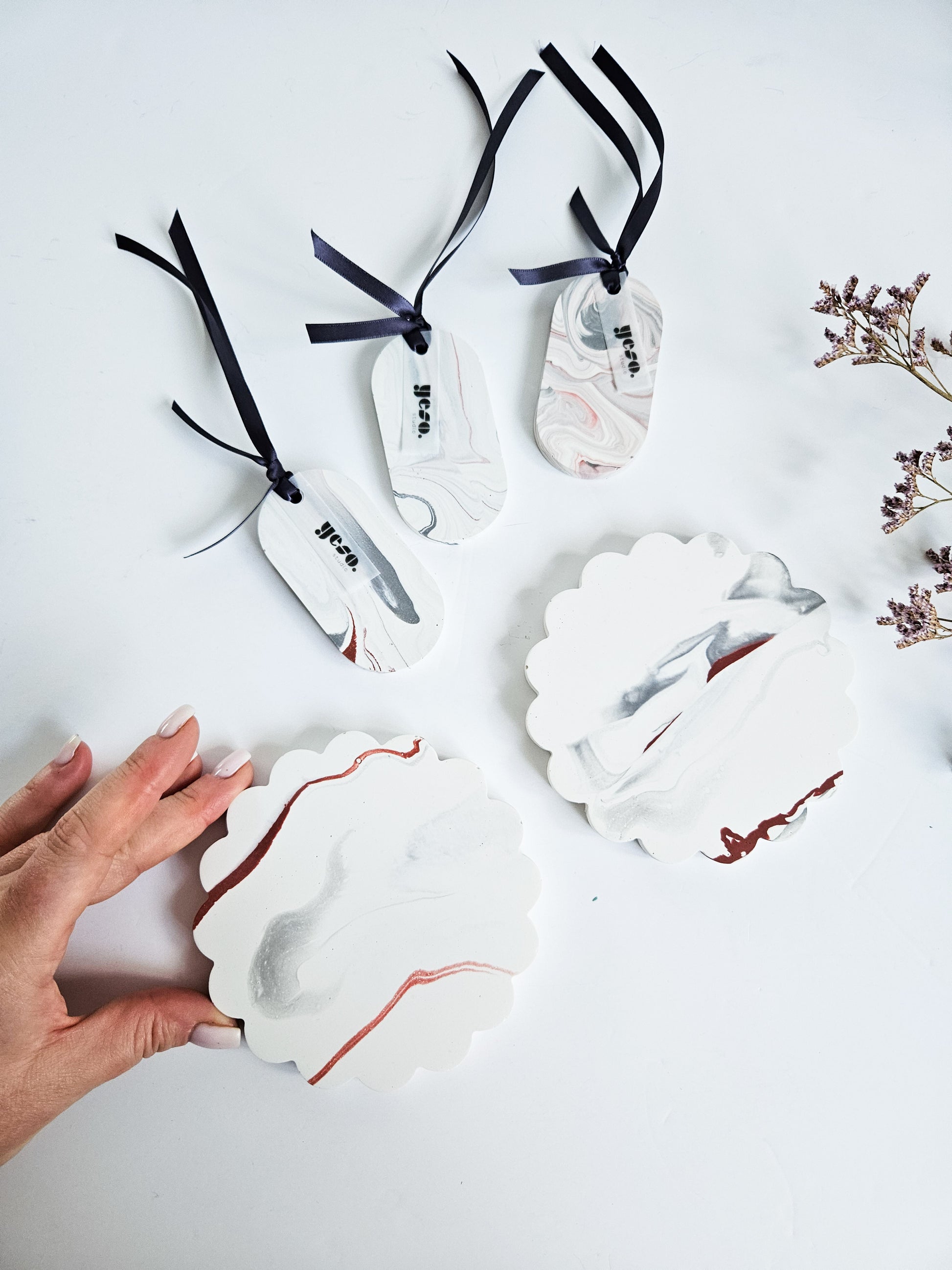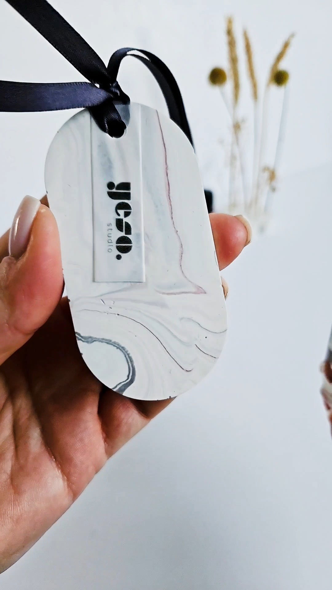 A beautiful set of three oval Aroma Stone Tags in a soft, balanced grey and white marble effect with a hint of red. These handmade tags bring a subtle elegance and can complement any room décor. Each tag is one-of-a-kind and poured by hand from eco-friendly Jesmonite, finished with a sleek anthracite ribbon for easy hanging.