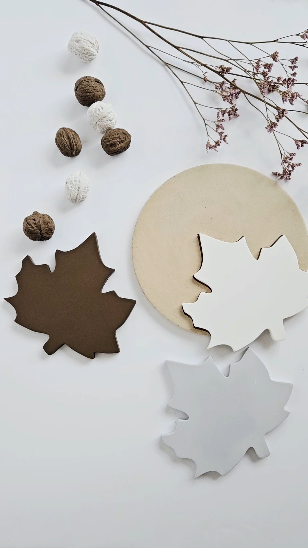 Perfect for holding jewellery, cosmetics, or small trinkets, this set also serves as a stylish base for hot or cold drinks, adding an elegant seasonal touch to your space. Hand-poured from eco-friendly Jesmonite, it combines style, durability, and sustainability in one beautiful design. The round tray is carefully carved to nestle up to a maple leaf-shaped coaster, creating a harmonious and versatile piece. An original design by YESOstudio.
