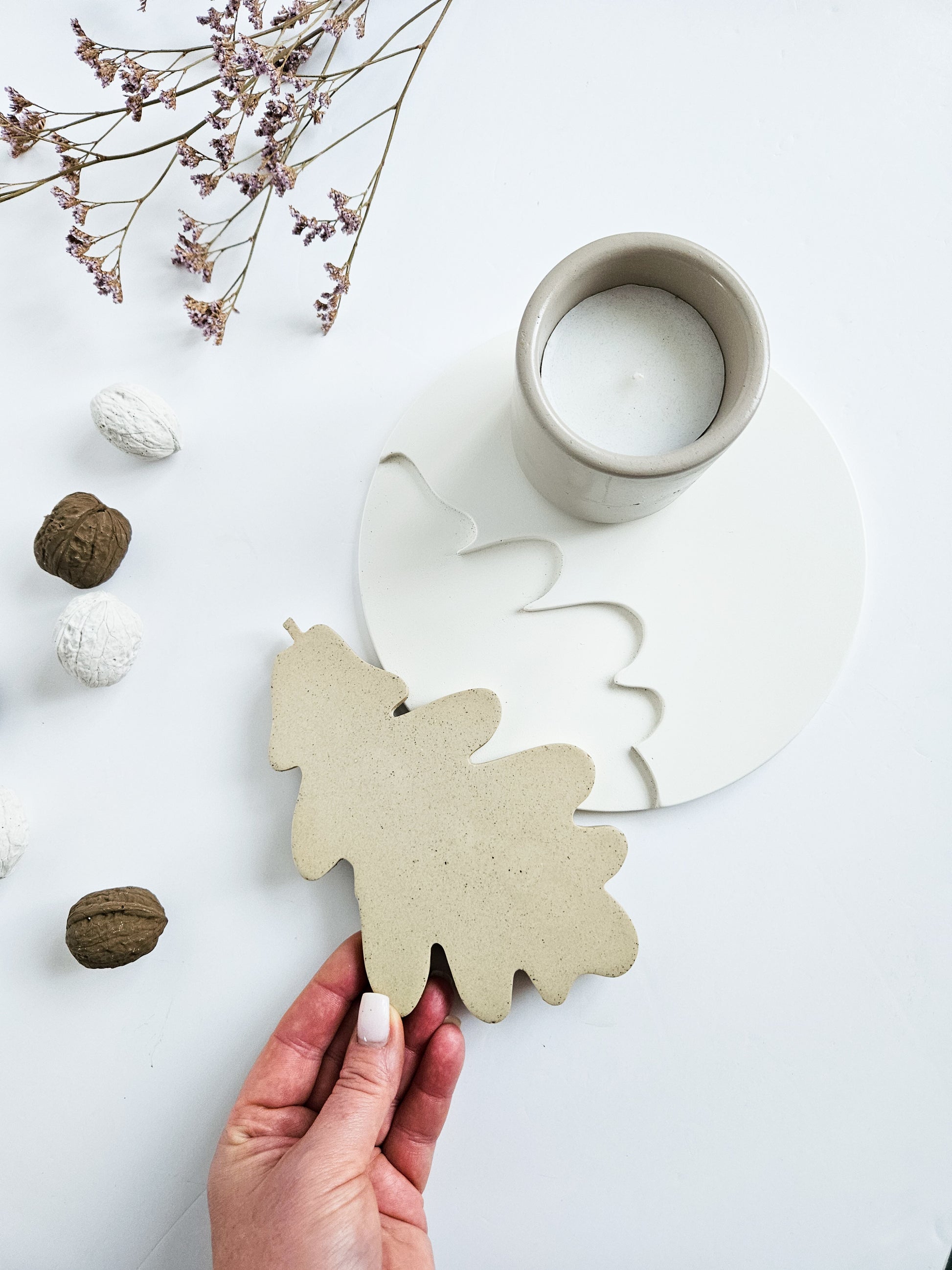 Perfect for holding jewellery, cosmetics, or small trinkets, this set also serves as a stylish base for hot or cold drinks, adding an elegant seasonal touch to your space. Hand-poured from eco-friendly Jesmonite, it combines style, durability, and sustainability in one beautiful design. The round tray is carefully carved to nestle up to a oak leaf-shaped coaster, creating a harmonious and versatile piece. An original design by YESOstudio.