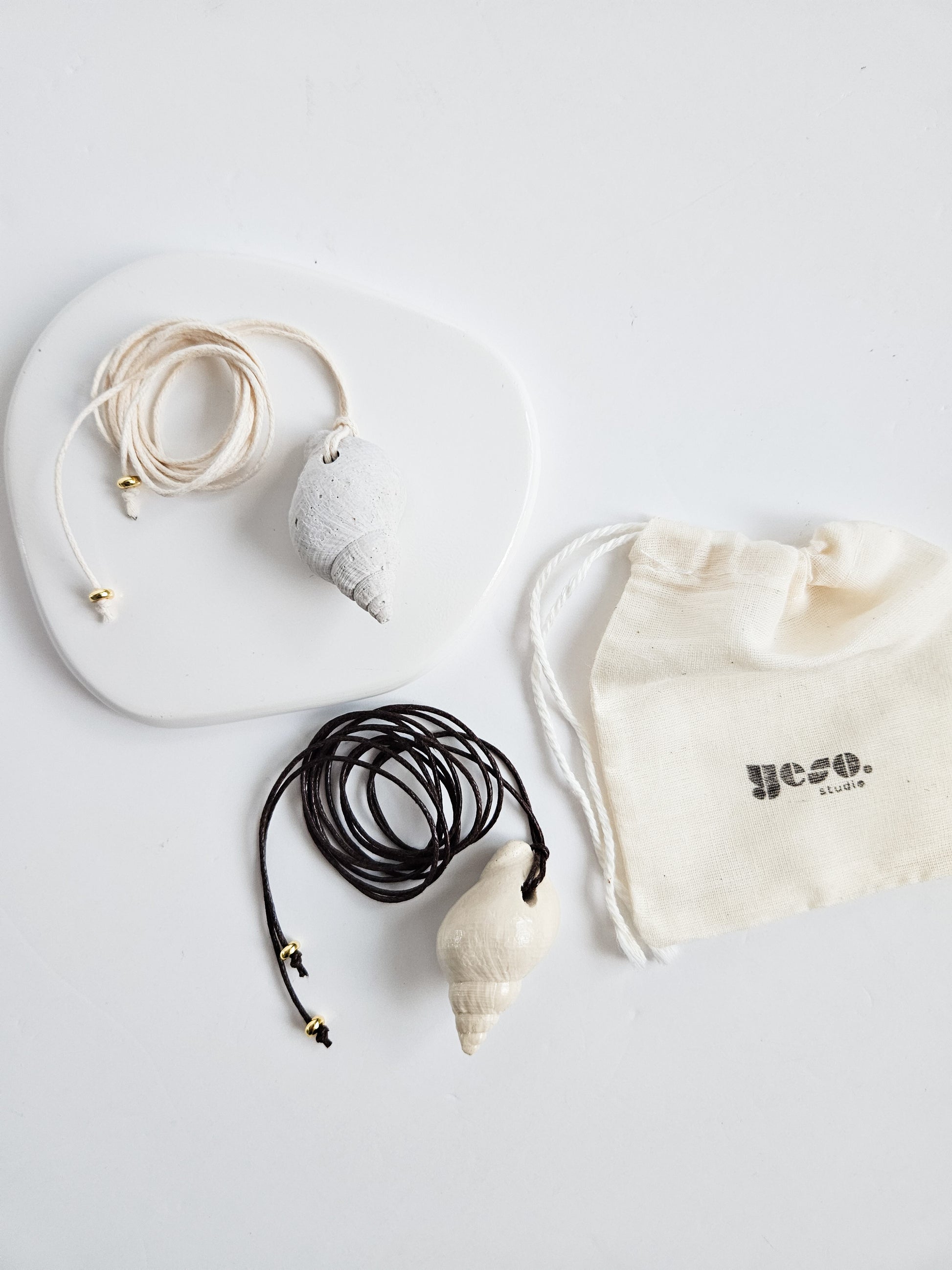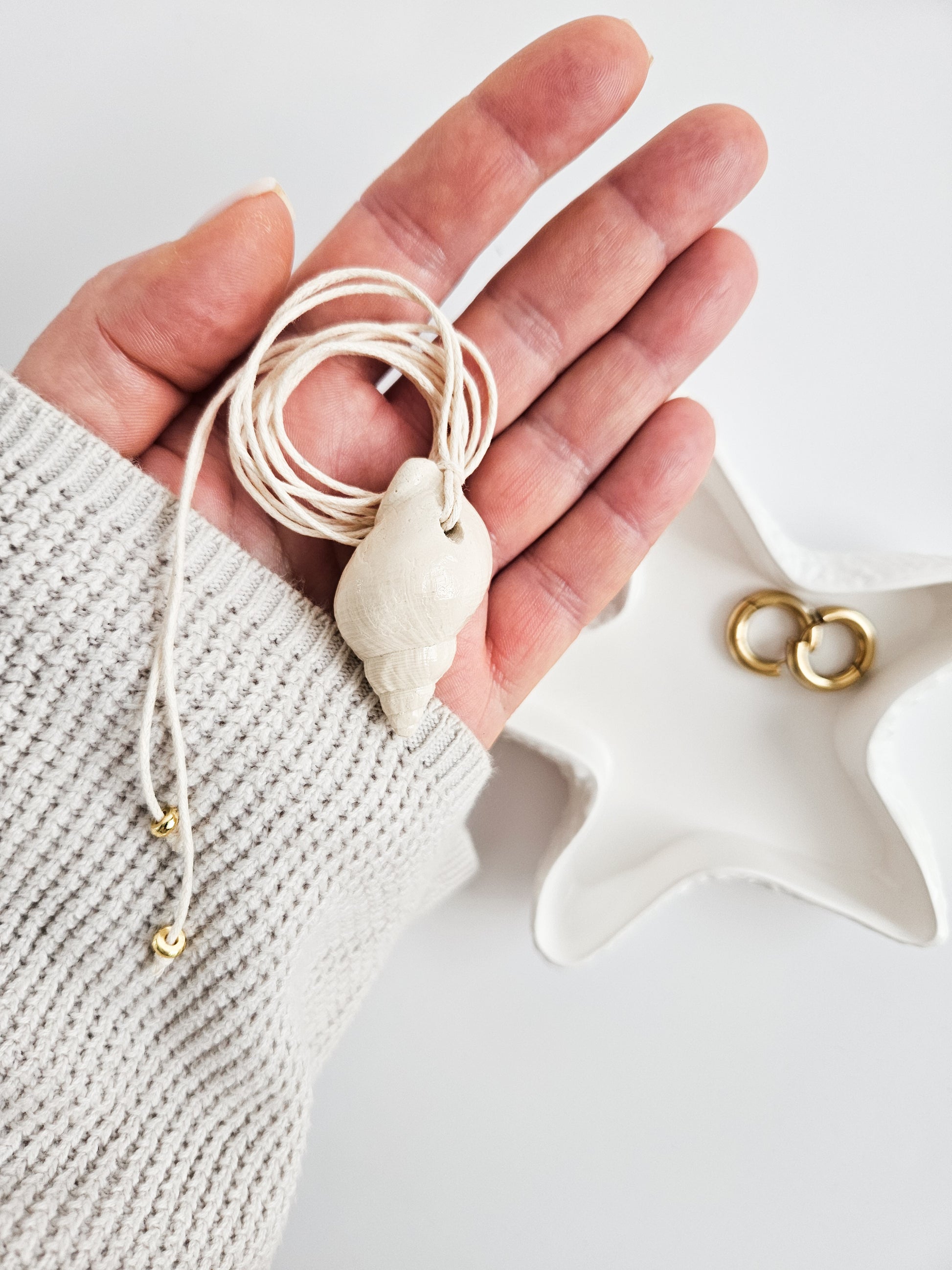 Inspired by nature, this handmade Whelk Seashell Necklace brings the essence of the British seaside to your everyday style. The beautifully coiled shell pendant is handcrafted from eco-friendly Jesmonite in a soft beige tone, available in your choice of matte or glossy finish, both water-resistant.